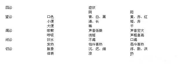 在辩证上,虽有阴、阳、表、里、寒、热、虚、实八纲,但八纲之中又以阴阳作为总纲来统领寒热虚实表里,其中表证、热证、实证属阳,里阳,寒证、虚证属阴。临诊时应用四诊(望、闻、问、切)所得的许多症状,可用阴阳归纳如下: