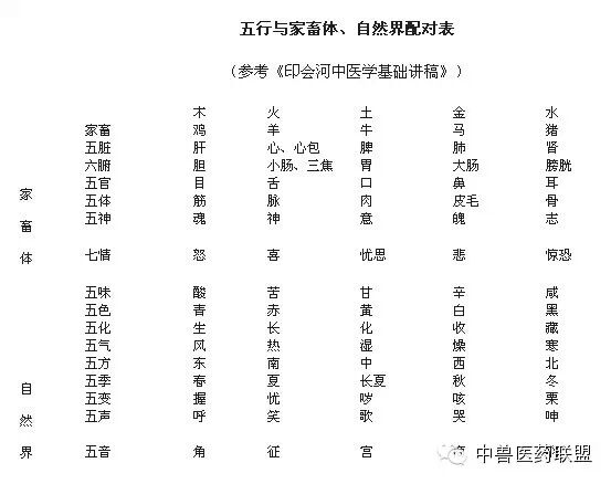 中兽医理论将五行学说用于说明家畜机体与自然的关系,主要体现在将五脏比类对应于五行,用五行之间的生克乘侮关系推论五脏六腑之间的相互协调、相互制衡情况。兽医鼻祖马师皇说:“马者,兽也。禀二气五行,长于灰台之下,与人并生于天地之间,有任重致远之功,代人之劳,而也待人之养(《元亨疗马集·马师皇问对脉色论》)。《元亨疗马集·论马口色者何也》谓:“夫肝者,东方木也,甲乙为主,壬癸相生,庚辛相克。色应左部卧蚕,合于周围排齿,旺于春季,寅卯辰月当权。……心者,南方火也,丙丁为主,甲乙相生,壬癸相克。……旺于夏季,巳午当权。……夫脾者,中央土也,戊己为主,火部相生,木星为难,应之于唇,合之于舌,旺于四季月末,辰戌丑未当权。……夫肺者,西方金也,庚辛为主,戊己相生,丙丁为难,色应右关,合于唇色,旺于秋季,申酉戌月当权。……夫肾者,壬癸水也,水星为主,金部相生,土星为难,应于排齿,合于玉户,旺在三冬,亥子丑月当权。”