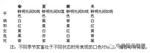 中兽医理论主要是运用五行生克乘侮规律来说明脏腑病变后相互间的影响或传变。不过病邪传变与否,关系到某一脏的虚实,即所谓“虚则受邪,实则不受邪”。其次也关系到病邪的性质和治疗的措施,故不能将五脏病邪传变与五行生克机械死板地硬套。《马师皇问对脉色论》在论及不同季节诊察口色,以判断家畜机体平、病、和、生、危、死,就是运用五行生克理论进行判断的。如:春者,肝旺也,甲乙当令,壬癸相生。凡口中之色鲜明光润如桃色者,平;白者,病;红者,和;黄者,生;黑者,危;青者,死。何谓平?春色如桃,百病俱消。白色者,肺金之色也,春现者,病,盖木逢金也。黄色者,脾土之色,春见者,生,盖肝病传脾,木赖土滋也。黑色者,肾水之色,春见者,危,盖三春黑色,五脏灭绝。青色者,肝木之色,春见者,死,盖春间青紫,木亏肝死。下表为四季口色与机体状况之关系表。
