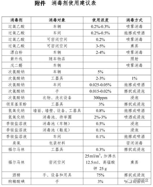建议消毒池(桶)用2%烧碱,常规喷雾消毒用1:200—400复合醛,气溶胶吸入消毒用饮水消毒浓度复合碘,污水沟,池用漂白粉。车辆消毒用0.5%过氧乙酸或5%次氯酸钠,生活区场地和生产区道路地面用10%石灰乳,再加2%烧碱。办公室、食堂、宿舍、生产区消毒通道内外更衣室用2%烧碱,猪场大门口洗手消毒和生产区消毒通道内消毒池用皮肤消毒浓度的复合碘或过氧乙酸。
